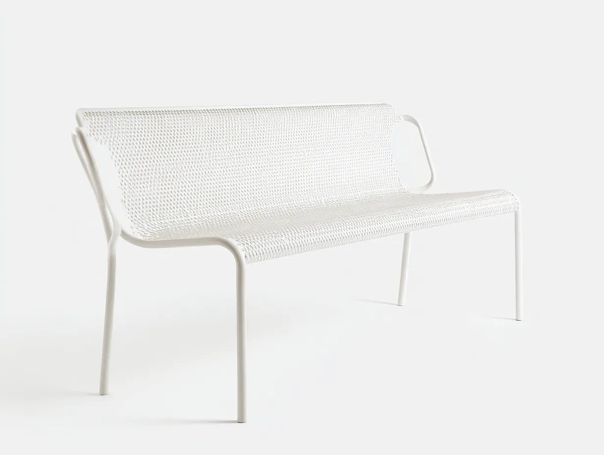 Fabricado en metal con acabado blanco roto, este banco ofrece una estructura firme y estable para el uso cotidiano en exterior. La superficie de malla continua, los brazos integrados y las patas delgadas proporcionan una combinación adecuada de resistencia, durabilidad y presencia decorativa en el jardín.