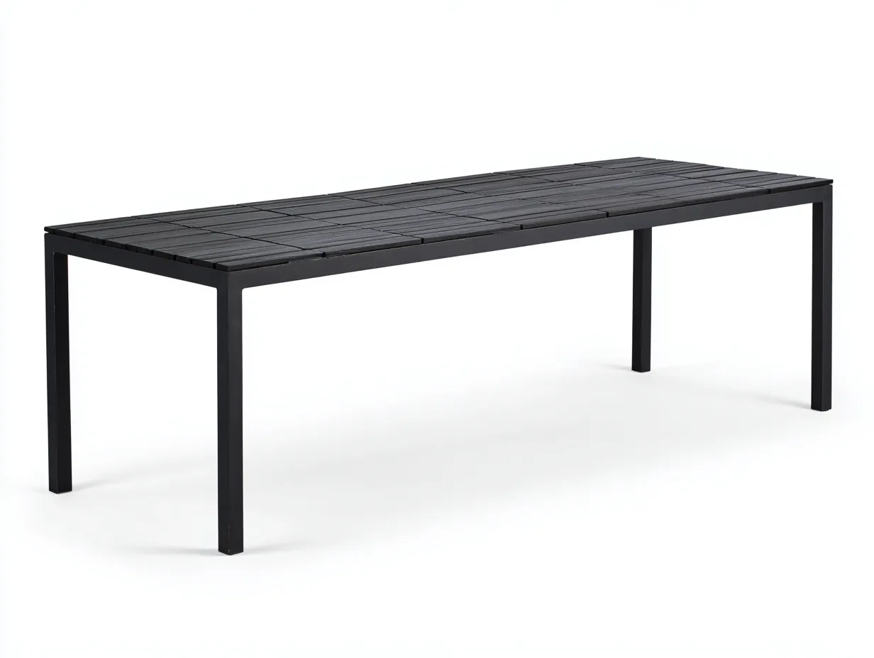 El tablero combina lamas en tono negro con una estructura metálica resistente, preparada para un uso habitual en espacios exteriores. El acabado mate refuerza una estética discreta y moderna, mientras que la base lineal aporta una imagen ligera y estable. La combinación de materiales facilita una integración versátil en ambientes de exterior.