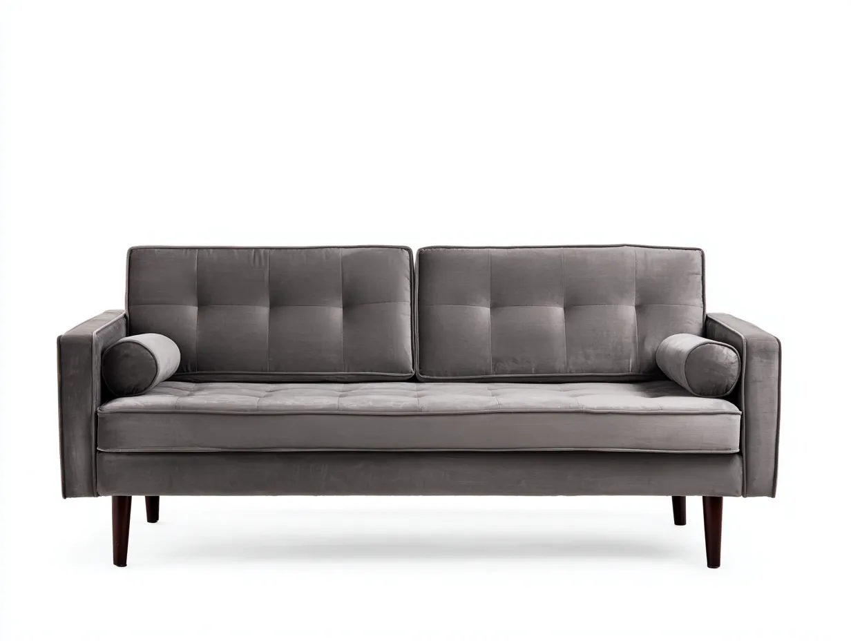 Está tapizado en terciopelo suave, un material agradable al tacto que aporta profundidad visual y un acabado elegante. La estructura se completa con patas de madera oscura, que añaden estabilidad y un contraste cálido con el gris del tejido. El conjunto mantiene una presencia equilibrada y versátil, fácil de integrar en interiores modernos, clásicos suaves o de inspiración contemporánea.