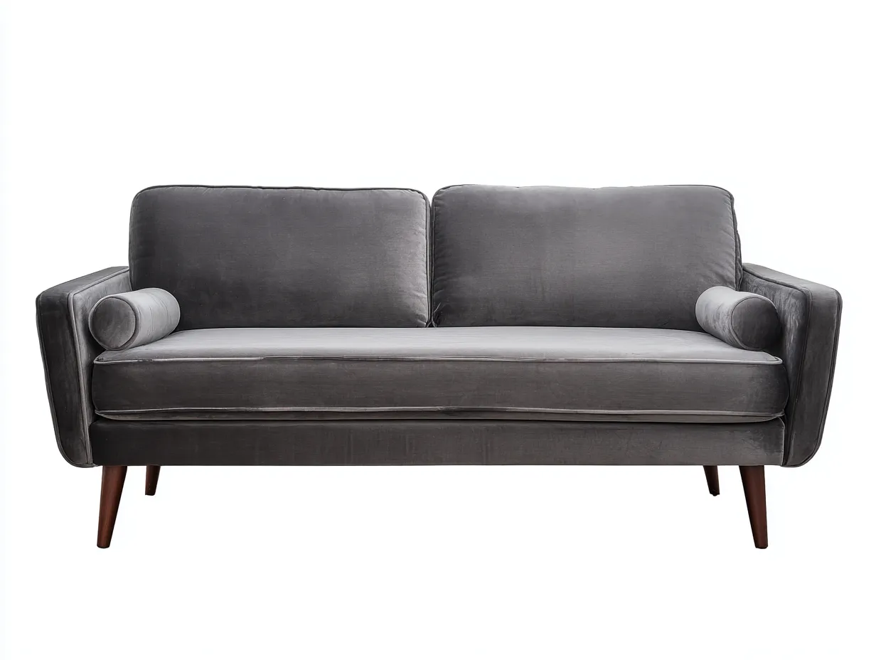 Está tapizado en terciopelo de tacto suave, un material que aporta profundidad visual y una imagen cuidada. La estructura se apoya sobre patas de madera en tono oscuro, que refuerzan la estabilidad y crean un contraste cálido con el tejido. El acabado general mantiene una apariencia uniforme y elegante, adecuada para interiores modernos, clásicos suaves o de inspiración retro actualizada.